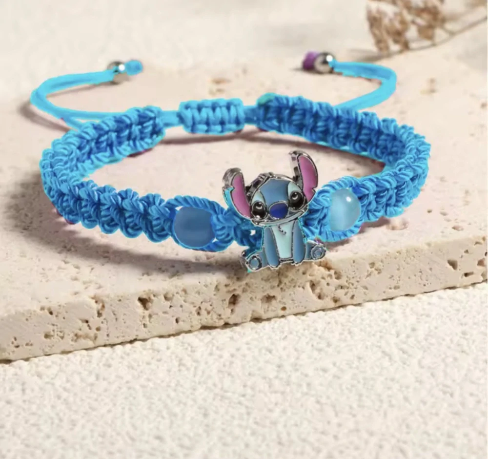 Pletený náramek se 2 modrými, 2 stříbrnými korálky a postavičkou Stitche.