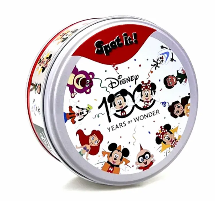 V této speciální edici klasické postřehové hry Dobble-Spot it: 100 let Disney bude vaším úkolem najít dvě shodné postavy z vašich oblíbených filmů Disney a Pixar.