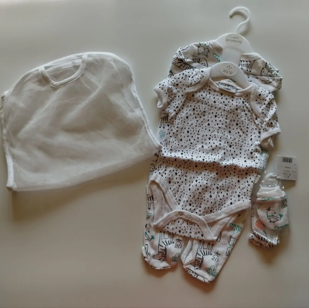 Set obsahuje overálek s dlouhým rukávem, bodyčko s krátkým rukávem, čepici, rukavičky proti škrábání a síťovaný pytel, který může sloužit k šetrnému praní setu.