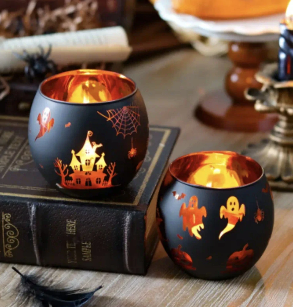 Skleněné svícny - HALLOWEEN - 2 ks. Nové v krabičce. Skleněné svícny na čajové svíčky poslouží jako krásná dekorace na HALLOWEEN. Balení obsahuje 2 kusy svícnů. (čajové svíčky nejsou součástí balení.)